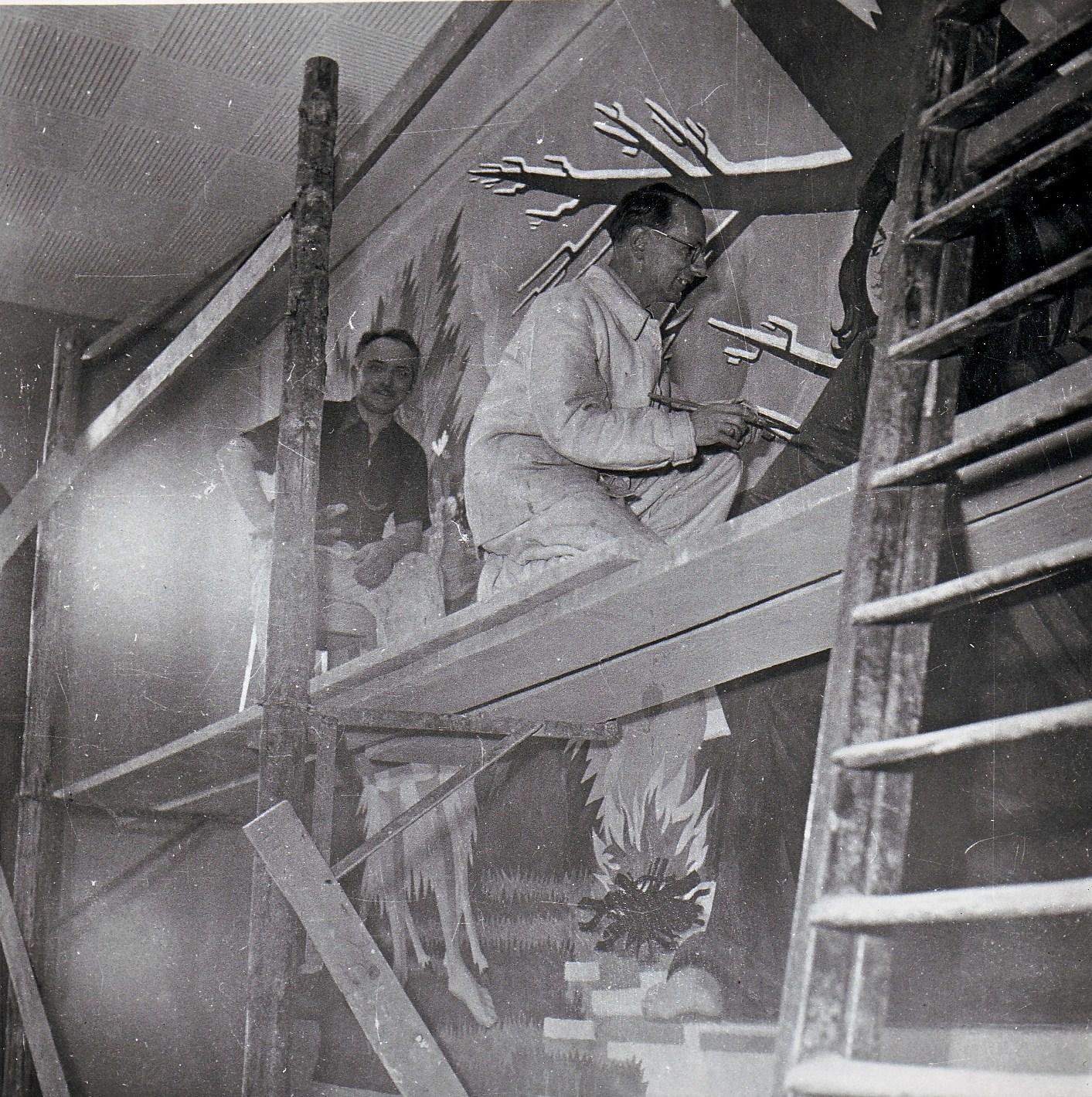 Émile Chambon travaillant à sa fresque pour le Collège moderne (actuelle École de Culture Générale Ella-Maillart), à Genève, 1951