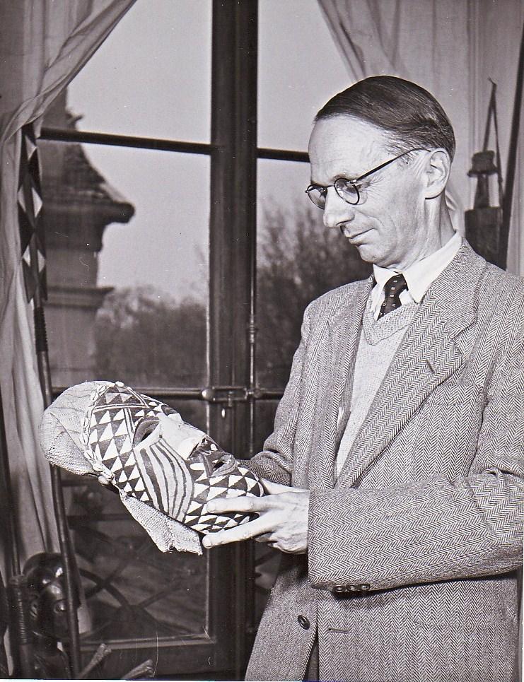 Émile Chambon tenant un masque africain de sa collection